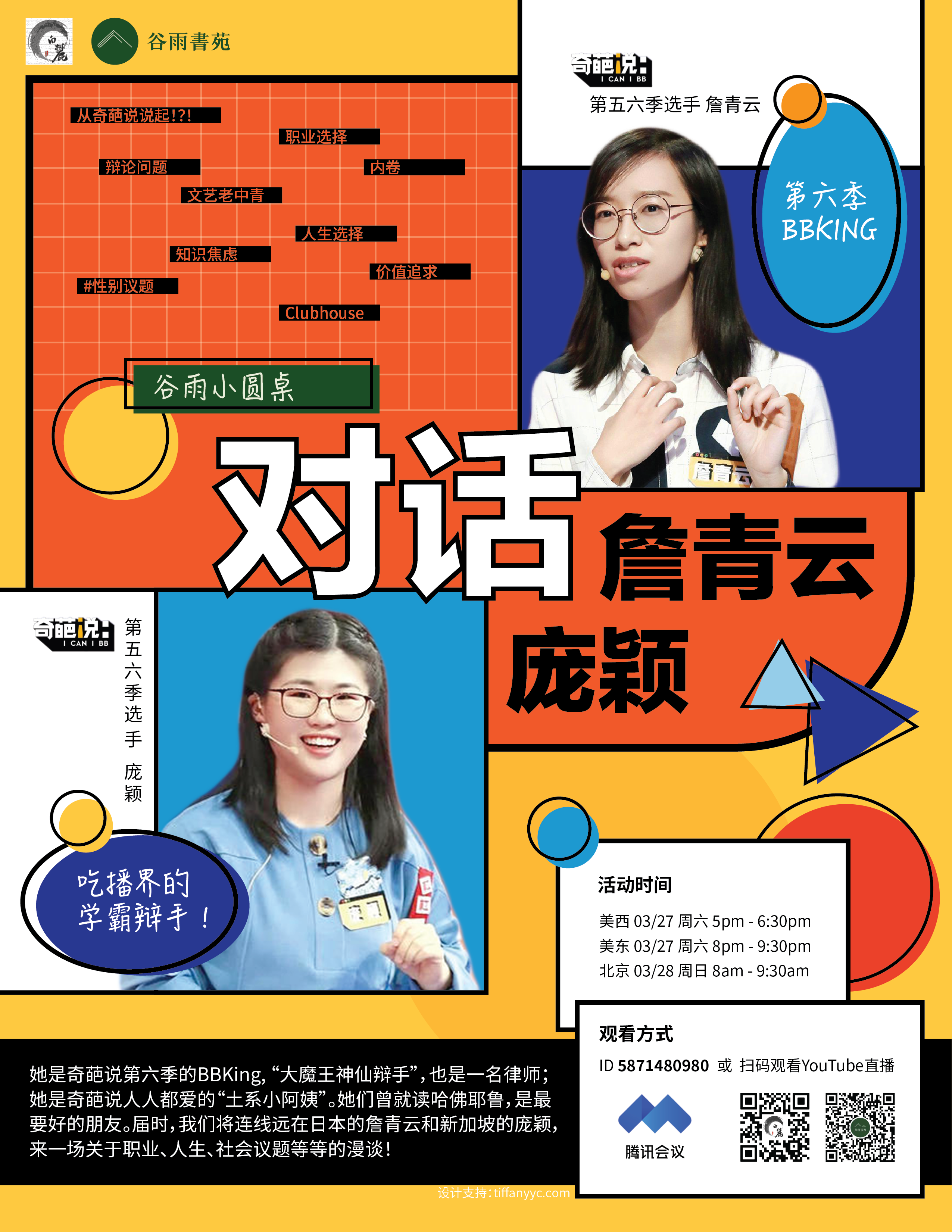 谷雨重磅!喜欢《奇葩说》的小伙伴们注意啦🎺,我们把詹青云庞颖请到了谷雨小圆桌!美西时间3月27号周六晚五点,请大家一起观看直播,一起畅聊奇葩说,漫谈职业人生社会等等话题。到时候也欢迎大家在Q&A环节踊跃交流。