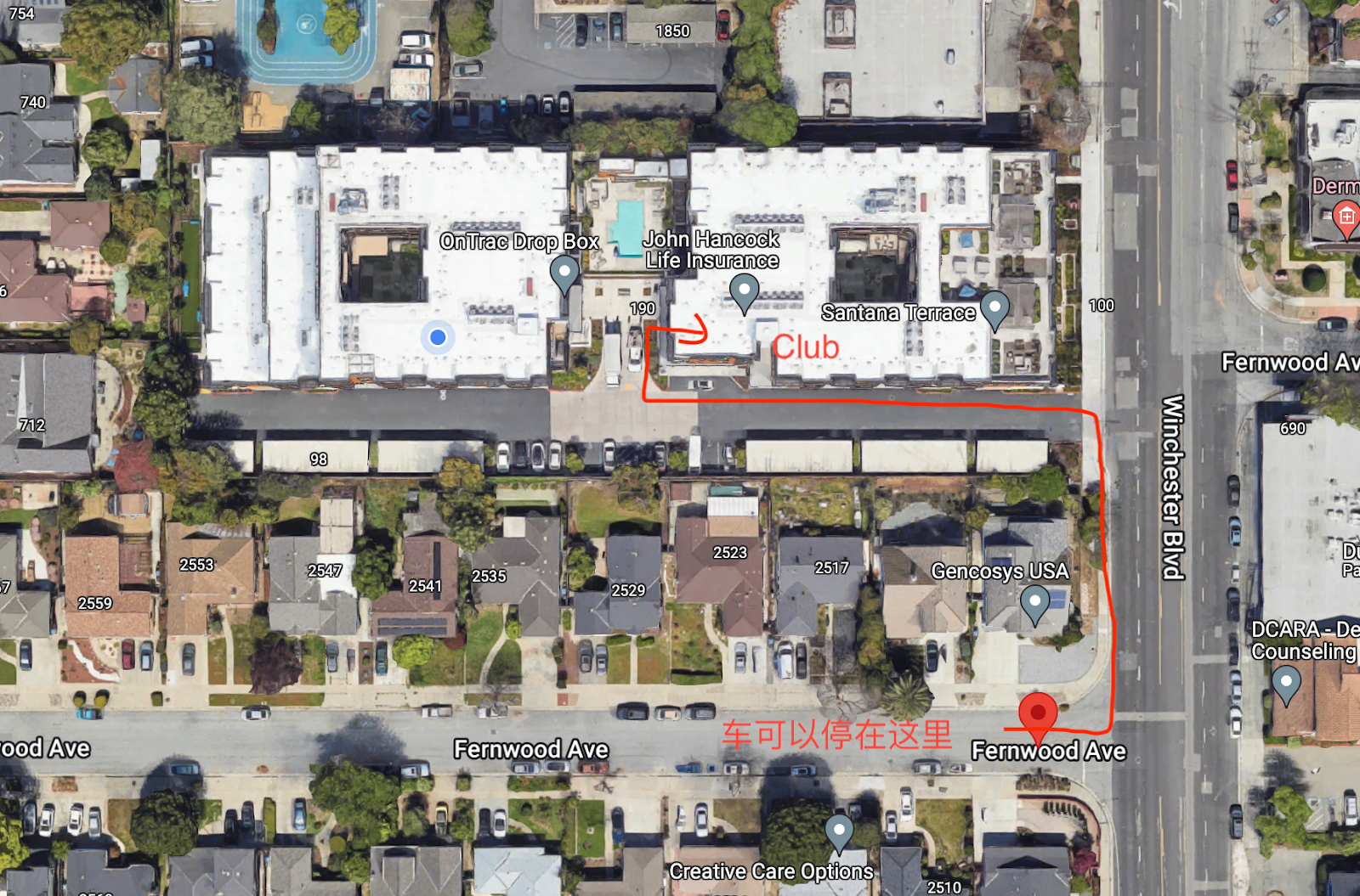 停车指南: 由于小区停车位非常有限,建议大家将GPS定位在与小区一墙之隔的Fernwood Ave上, 具体的链接是:https://goo.gl/maps/p5V9c5FR5vDxvrFp8 坐标是:37°19’41.1”N 121°57’01.7”W 地址是:2501-2599 Fernwood Ave, San Jose, CA 95117