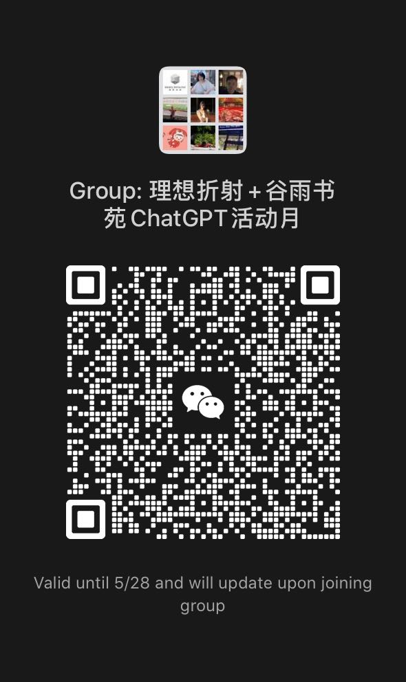 二零二三年五到六月份,谷雨书苑联合理想折射,推出ChatGPT系列分享活动。活动分四期进行: