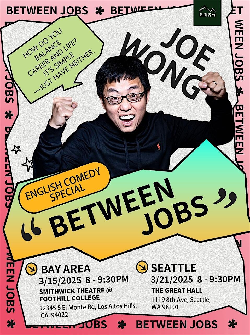 Join us for an unforgettable evening with Joe Wong黄西, the renowned comedian and talk show host, as he brings his signature humor and wit to the stage. This event, titled “Between Jobs,” promises to be a thought-provoking and entertaining exploration of work life balance.